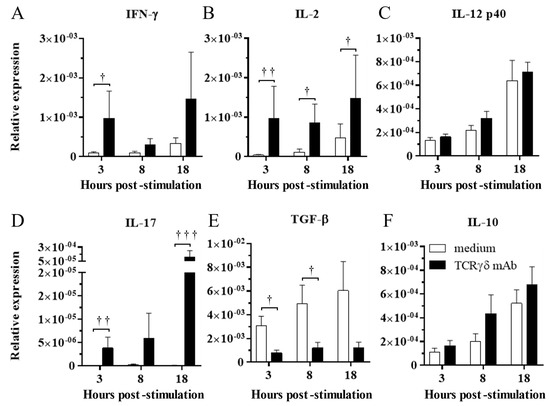 Cytokine expression profiles in the PBMCs stimulated with or without anti-TCRγδ antibody at 3, 8, and 18 hps. The PBMCs obtained from healthy SPF chickens were stimulated with or without anti-TCRγδ antibody for 3, 8, and 18 h, and RNA were extracted from the cultured PBMCs. Expression of cytokines, IFN-γ (A), IL-2 (B), IL-12p40 (C), IL-17A (D), TGF-β (E), and IL-10 (F) was determined by real-time PCR. Target genes were normalized by β-actin. TCRγδ-unstimulated cells were used as a negative control. Data represent the mean of 6 biological replicates ± SE at each time point. Significant differences are indicated by †: p < 0.05, ††: p < 0.01, and †††: p < 0.001.