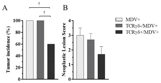 Tumor incidence and neoplastic lesion scores at 21 days post-cell infusion and MDV challenge. TCRγδ-activated or -unactivated PBMCs were infused to recipient chickens at 21-days-old, and the chickens were challenged with MDV. Tumor incidence (A) and neoplastic lesion scores (B) were determined by necropsy in the MDV+, the TCRγδ-/MDV+, and the TCRγδ+/MDV+ groups at 21 dpi. Tumor scores were assessed by the number of tumor-bearing organs. Data of the neoplastic lesion scores represent the mean of 10 biological replicates ± SE in each group. Significant differences are indicated by †: p < 0.05.