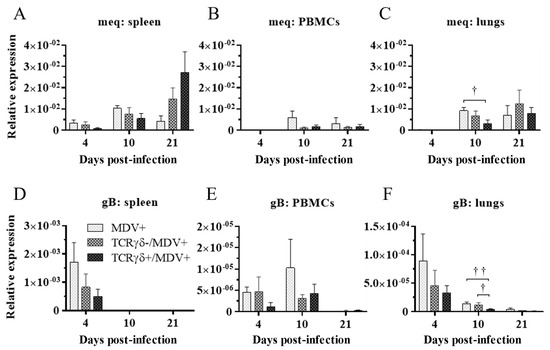 Transcripts of MDV genes in the spleen, PBMCs, and lungs at 4, 10, and 21 dpi. TCRγδ-activated or -unactivated PBMCs were infused to recipient chickens at 21-days-old, and the chickens were challenged with MDV. Spleen, PBMCs, and lungs samples were collected from the MDV+, the TCRγδ-/MDV+, and the TCRγδ+/MDV+ groups at 4, 10, and 21 dpi. Transcripts of MDV genes, meq (A–C), and gB (D–F), in the spleen, PBMCs, and lungs collected from each group at 4, 10, and 21 dpi were determined by real-time PCR. Target genes were normalized by β-actin. Data represent the mean of 5 biological replicates ± SE in each group at each time point. Significant differences are indicated by †: p < 0.05 and ††: p < 0.01.