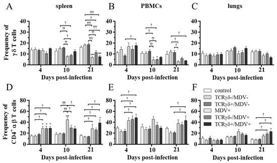 Frequency of γδ T cells and CD4+ αβ T cells in the spleen, PBMCs, and lungs, at 4, 10, and 21 dpi. TCRγδ-activated or -unactivated PBMCs were infused to recipient chickens at 21-days-old, and the chickens were challenged with MDV. Percentages of γδ T cells (A–C) and CD4+ αβ T cells (D–F) within live lymphocyte populations in the spleen, PBMCs, and lungs collected from the control, the TCRγδ-/MDV-, the TCRγδ+/MDV-, the MDV+, the TCRγδ-/MDV+, and the TCRγδ+/MDV+ groups at 4, 10, and 21 dpi are shown. Data represent the mean of 5 biological replicates ± SE in each group at each time point. Significant differences are indicated by *: p < 0.05 (vs. control), ***: p < 0.001 (vs. control), †: p < 0.05, ††: p < 0.01, and †††: p < 0.001.