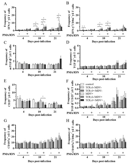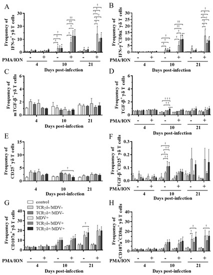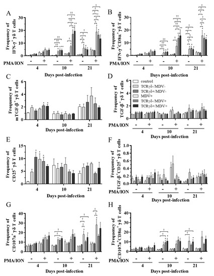 Cytokine and immune system molecule profiles in γδ T cells derived from the PBMCs at 4, 10, and 21 dpi. The PBMCs obtained from the control, the unstimulated PBMCs control, the TCRγδ-/MDV-, the TCRγδ+/MDV-, the MDV+, the TCRγδ-/MDV+, and the TCRγδ+/MDV+ groups were cultured with and without PMA/ION for 4 h. Percentages of IFN-γ+ γδ T cells (A), IFN-γ+CD8α+ γδ T cells (B), mTGF-β γδ T cells (C), TGF-β γδ T cells (D), CD25+ γδ T cells (E), TGF-β+CD25+ γδ T cells (F), CD107a+ γδ T cells (G), and CD107a+CD8α+ γδ T cells (H) within γδ T cell populations in the PBMCs collected from each group at 4, 10, and 21 dpi are shown. Data represent the mean of 5 biological replicates ± SE in each group at each time point. Significant differences are indicated by *: p < 0.05 (vs. control), **: p < 0.01 (vs. control), ***: p < 0.001 (vs. control), †: p < 0.05, ††: p < 0.01, and †††: p < 0.001.