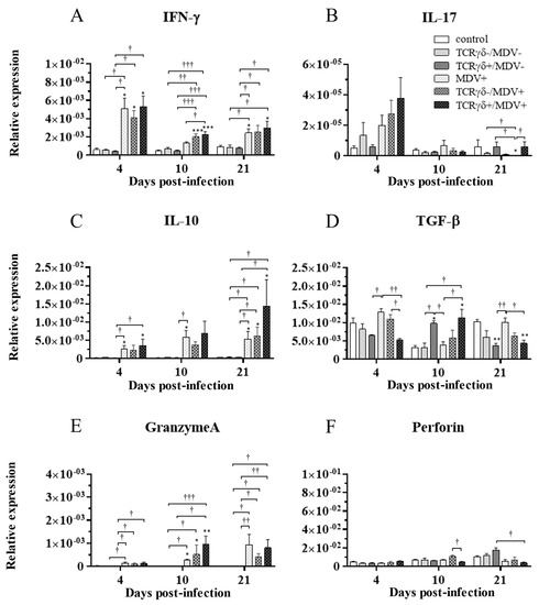 Cytokine, granzyme A, and perforin gene expression profiles in the spleen at 4, 10, and 21 dpi. Gene expression of IFN-γ (A), IL-17A (B), IL-10 (C), TGF-β (D), granzyme A (E), and perforin (F) in the spleen collected from the control, the unstimulated PBMCs control, the TCRγδ-/MDV-, the TCRγδ+/MDV-, the MDV+, the TCRγδ-/MDV+, and the TCRγδ+/MDV+ groups at 4, 10, and 21 dpi was determined by real-time PCR. Target genes were normalized by β-actin. Data represent the mean of 5 biological replicates ± SE in each group at each time point. Significant differences are indicated by *: p < 0.05 (vs. control), **: p < 0.01 (vs. control), ***: p < 0.001 (vs. control), †: p < 0.05, ††: p < 0.01, and †††: p < 0.001.