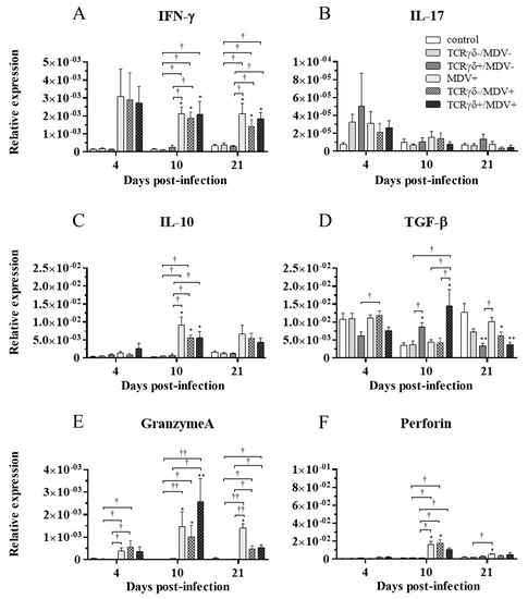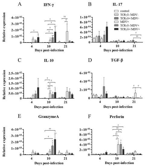 Cytokine, granzyme A, and perforin gene expression profiles in the lungs at 4, 10, and 21 dpi. Gene expression of IFN-γ (A), IL-17A (B), IL-10 (C), TGF-β (D), granzyme A (E), and perforin (F) in the lungs collected from the control, TCRγδ-/MDV-, the TCRγδ+/MDV-, the MDV+, the TCRγδ-/MDV+, and the TCRγδ+/MDV+ groups at 4, 10, and 21 dpi was determined by real-time PCR. Target genes were normalized by β-actin. Data represent the mean of 5 biological replicates ± SE in each group at each time point. Significant differences are indicated by *: p < 0.05 (vs. control), **: p < 0.01 (vs. control), †: p < 0.05, and ††: p < 0.01.