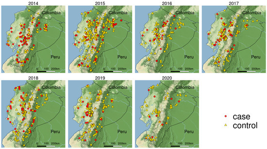 Spatial representation of the study area and location of cases and controls of CSF in Ecuador study period 2014–2020.