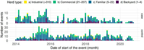 Distribution of events (cases and controls) reported between 2014 and 2020 in Ecuador; bars represent monthly counts, height and colours of bars according to the type of herd (different scales on the y-axis).