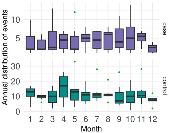 Distributed by months, the mean number of cases was 4.39 ± 3.09; with controls, the mean was 11.31 ± 6.38 There was a tendency to increase twice a year around April and October (Figure 3).