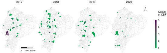 Representation of the number of observed CSF cases (number of positive premises) in Ecuador grouped by parish from 2017 to 2020.