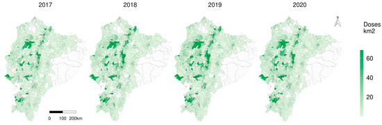 Figure 5 reveals that there was a marked higher density on the number of doses of CSF applied by square kilometre in the western centre (Santo Domingo), the north (Carchi), west south (El Oro) and the central highlands (Cotopaxi, Chimborazo), and this general pattern repeated over the years; however, there were 105, 78, 52 and 62 parishes without vaccination coverage in 2017, 2018, 2019 and 2020, respectively (note the white parishes on Figure 5).