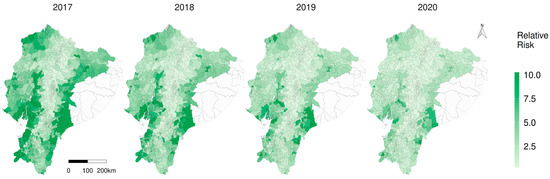 Spatiotemporal representation of the relative risk (RR) of CSF in Ecuador.