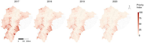 According to the priority index (PI), primary parishes of concern include Tundayme located in the eastern Amazon, followed by Tachina in the north-western and Paletilla in the southern zone (Figure 7). The provinces with higher risk, considering the average RR per province in the year 2020, were Morona Santiago (3.68), Los Rios (3.12) and Santa Elena, (3.07); the average relative risk intended to prioritise prevention and control activities by province is available in Supplementary material SM3, and the individual parish RR details are in Supplementary material SM4. Considerations about some of the limitations of the study are available in the Appendix A.