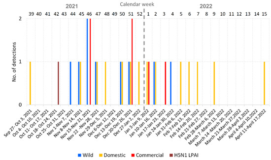 In the Czech Republic, the 2021/2022 H5N1 HPAI season started with an outbreak in a backyard poultry flock on 27 September 2021 [11] and lasted until 13 April 2022 (calendar weeks 39–15; Figure 1). Like in the previous season [13], infections in backyard poultry were observed throughout the entire outbreak, while the infections in commercial poultry occurred from November 2021 to January 2022. In wild birds, the H5N1 HPAI virus was detected only sporadically.