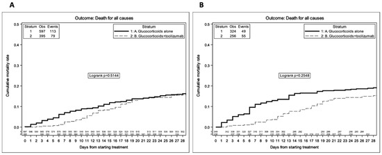 Survival KM estimates stratified by treatment group—unweighted analysis (A) and weighted analysis after adjustment for age, ethnicity, CCI, baseline CRP, and PaO2/FiO2 ratio (B).