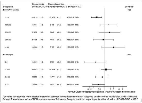 We believe that our results are very relevant and contribute to identifying patients who could benefit the most from glucocorticoids + tocilizumab. Indeed, although the use of tocilizumab plus glucocorticoids is now recommended by international guidelines [29], there is still an ongoing debate regarding whether CRP is the most important and only marker to be used to guide initiation of tocilizumab in patients failing glucocorticoids and which clinical cut-off should be used. Earlier analysis from our group showed that the effect of tocilizumab was greater at low values of PaO2/FiO2 ratio, which was confirmed here, with participants with a PaO2/FiO2 < 150 mmHg at the time of initiation glucocorticoids + tocilizumab being those showing the greatest benefit [10]. Tocilizumab is an IL-6 receptor antagonist, and a plasma level of IL-6 >30 pg/mL has also been associated with both severe COVID-19 and response to treatment [30,31,32]. Unfortunately, we could not stratify the analysis by IL-6 levels because too many patients had missing values for this marker. Specific protocol studies are needed to investigate the utility of IL-6 for guiding therapy initiation in this setting.