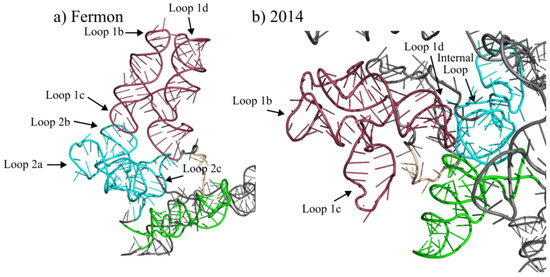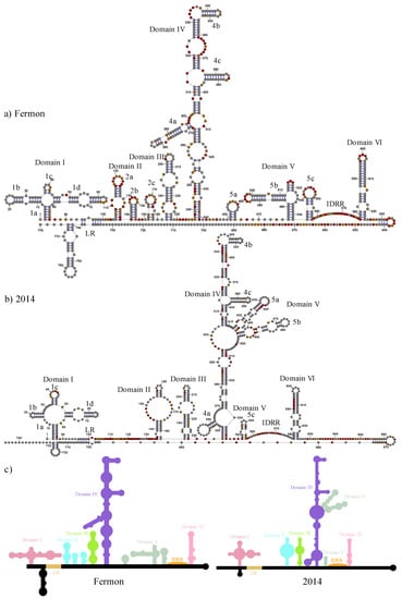 Domain VI is highly conserved between the Fermon and 2014 strains (Figure 2). It occupies the same number of nucleotides and is in the same position with only a slight expansion of the second internal loop at position 586 and an A-to-G substitution at position 600. At the tertiary level, the model shows the Fermon strain domain VI separated from the rest of the molecule and located close to domain IV. However, in the 2014 predicted structure, domain VI is not separated as much from the rest of the molecule and is most closely associated with domain I (Figure 7).