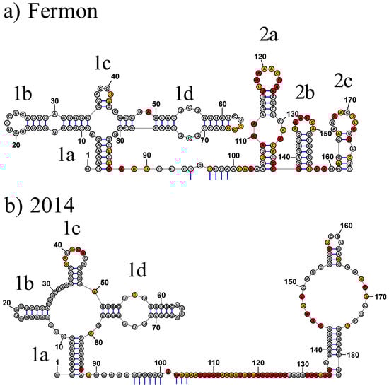 Just as the secondary structure changes significantly between the Fermon and 2014 strains, so does the model of the tertiary structure (Figure 5). Within the Fermon strain, all three domain II stem structures are orientated outward from the center of the molecule and towards the stem-loops of domain I. Stem-loops 2a and 2b are the closest to stem-loop 1b, while stem-loop 2c is set further away (Figure 5a). In the 2014 strain, the domain II stem, with an internal loop and the tetraloop at its end, are orientated away from domains I and III and appears in the center of the more globular molecule. However, stem-loop 1d is orientated towards the large internal loop of domain II (Figure 5b).