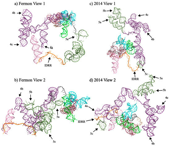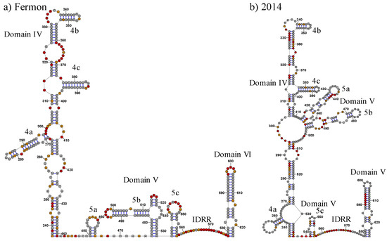 As would be expected, the formation of the IV/V super domain significantly impacts the model of the tertiary structure of the domain IV elements (Figure 7). Domain IV of the Fermon strain extends away from the majority of the molecule and has stems 4a and 4c associated with stem 5d of domain V. However, in the 2014 strain, domain IV takes on a different conformation, with stems 4b and 4c located closer to domains II and III, while stem 4a is located near the IDRR and stem 5c of domain V. Despite this, stems 4b and 4c are still separated from the rest of the molecule.