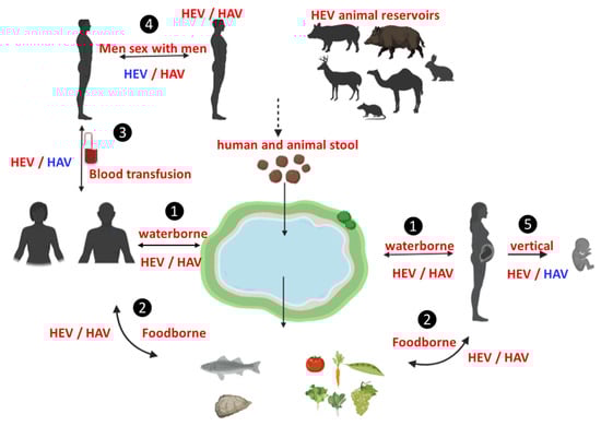 To predict the common modes of HAV/HEV dual infection, it is important to discuss the modes of transmission of each virus. Some modes of transmission are common to both viruses, while others are not (summarized in Figure 1). HAV and HEV infections are transmitted via contaminated water, which represents the fecal-oral route [15,27,28]. Foodborne infections are also caused by both viruses, but there are some differences. Foodborne HAV infections are common. Several products were associated with HAV-foodborne infections such as salads, sandwiches, multiple foods, fruits, and vegetables [29,30]. Recently HAV was detected in milk products and cheese [31,32]. Most foodborne-HAV infection is mediated through food handlers and restaurants and not animal reservoirs [29]. Foodborne HEV infections, caused by zoonotic genotypes, are mainly transmitted through ingestion of contaminated edible products from pigs, wild boars, deer, rabbits, and camels [19,33,34,35]. Also, ingestion of contaminated vegetables and fruits was associated with HEV infection. The water supply has been contaminated with either human or animal stool and has become a source of HEV transmission to these products during irrigation [30,36]. Importantly, HAV and HEV infections have been associated with the ingestion of seafood [37,38,39,40].
