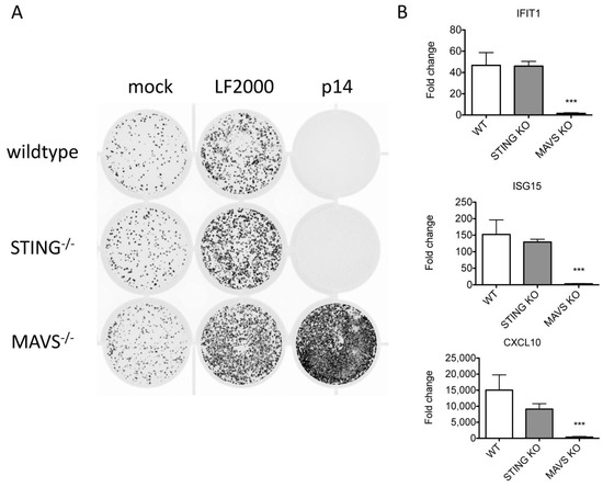 We previously showed that p14 lipoplexes trigger Ca2+- and IRF3-dependent upregulation of antiviral genes in the absence of exogenous nucleic acid or traditional viral PAMPs [13,14]. Canonical IRF3 activation requires scaffold proteins, such as STING or MAVS, to bring together IRF3 and its kinase TBK1 [24]. To investigate the role of these scaffold proteins in the response to p14-lipoplex fusion, we treated wildtype, STING−/− or MAVS−/− telomerase-immortalized human fibroblasts (THFs) with p14 lipoplexes and evaluated the antiviral response. While the antiviral response was intact in STING-deficient cells, it was absent in MAVS-deficient cells (Figure 2), indicating that components of the RNA-sensing pathway are required for the response to exogenous p14. In the absence of an antiviral response, the addition of lipofectamine or p14-lipoplexes enhanced VSV-GFP infection of THFs, as we previously observed.