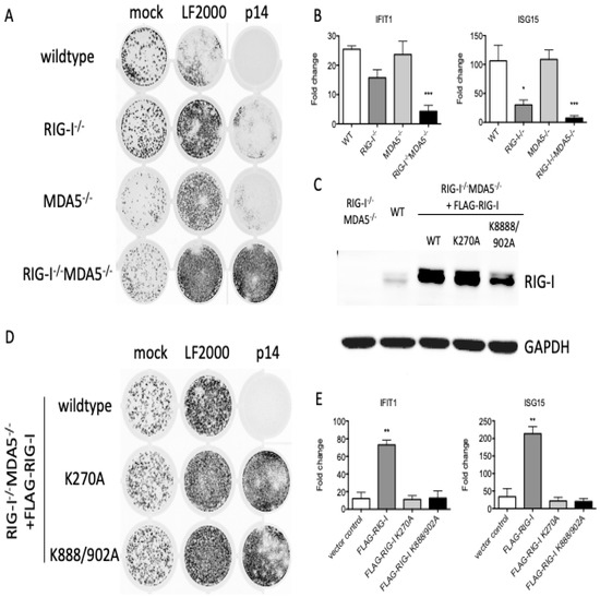 While MAVS potentially functions as an adaptor for multiple sensing proteins, the best characterized upstream sensors are RIG-I and MDA5. When we similarly treated wildtype, RIG-I−/−, MDA5−/− or RIG-I−/−MDA5−/− THFs with p14 lipoplexes, we found that RIG-I−/− THFs had impaired the antiviral (Figure 3A) and ISG (Figure 3B) responses, which were further diminished in RIG-I−/−MDA5−/− THFs. These data suggest that RIG-I and MDA5 collectively contribute to the antiviral response to p14 lipoplexes. RNA recognition by RIG-I or MDA5 involves RNA binding to an N-terminal helicase domain and exposure of a C-terminal CARD domain that interacts with MAVS [25]. To investigate the role of the RIG-I RNA binding domains in the recognition of p14 lipoplexes, we reconstituted RIGI−/−MDA5−/− THF cells with either wildtype or mutant RIG-I, including the K270A mutant which lacks ATPase activity [26] and the K888/902A mutant which lacks two lysine residues critical for RNA binding [27]. Control experiments confirmed similar expression levels of the wildtype and mutant proteins (Figure 3C). While the reconstitution of RIG-I−/−MDA5−/− THF cells with FLAG-RIG-I restored the antiviral response to p14 lipoplexes, reconstitution with either FLAG-RIG-I K270A or FLAG-RIG-I K888/902A failed to do so (Figure 3D,E). This finding suggests that both the ATPase and the RNA binding activities of RIG-I are important for the antiviral response to p14 lipoplexes, suggesting that the response to p14 involves the recognition of dsRNA.