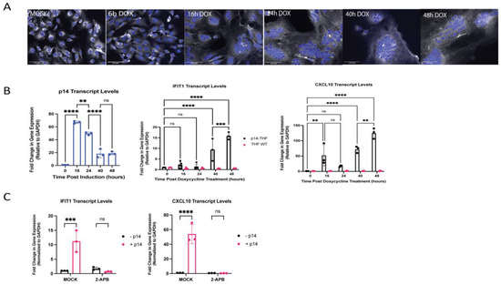 Endogenous expression of p14 triggers cell-cell fusion and an antiviral response in a Ca2+-dependent manner. THF-p14 cells were treated with 0.01 µg/mL of doxycycline and monitored over a 48 h time period. (A) Cell nuclei were stained with Hoechst 33,342 (blue), and cell membranes were stained with CellMask Deep Red (white). Scale bar indicates a size of 125 µm. (B) The presence of p14 in the cells upon doxycycline treatment was verified by RT-qPCR. (B) The levels of ISG expression in wildtype THF and p14-THF cells treated with 0.01 µg/mL of doxycycline were assessed by RT-qPCR from RNA harvested at various time points over a 48 h time course. The transcript levels were normalized to GAPDH level and plotted relative to those in uninduced (Time 0 h) cells. Groups were compared by one-way ANOVA (** for p < 0.01, *** for p < 0.001 and **** for p < 0.0001). (C) THF-p14 cells were treated with 0.01 µg/mL of doxycycline for 6 h, then treated with 200 µM 2-APB to block calcium release from the ER, and the ISG transcript levels were measured after 48 h.