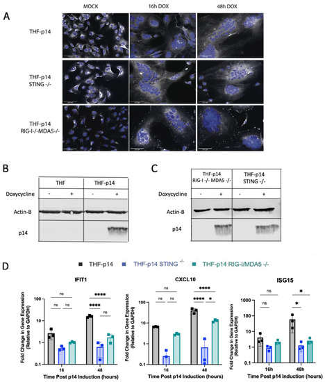 Both STING and RLRs are involved in the ISG response to endogenous p14. (A) STING−/− and RIG-I−/− MDA5−/− THF cells were modified to express p14 under a Tet-On inducible promoter. The cell nuclei were stained with Hoechst 33,342 (blue), and the cell membranes were stained with CellMask Deep Red (white). Scale bar indicates a size of 125 µm. (B) Protein extracts from p14-THF RIG-I−/−MDA5−/−, p14-THF STING−/− or p14-THF wildtype cells were separated by SDS-PAGE and probed with p14- and beta actin-specific antibodies. (C) Protein extracts from p14-THF RIG-I−/−MDA5−/− and p14-THF STING−/− were separated by SDS-PAGE and probed with p14- and beta actin-specific antibodies. (D) p14-THF RIG-I−/−MDA5−/−, p14-THF STING−/− and p14-THF wildtype cells were treated with 0.01 µg/mL of doxycycline for 16 or 48 h, and cellular RNA was harvested for RT-qPCR. The transcript levels were normalized to GAPDH level and are shown relative to those in uninduced cells (Time 0). Groups were compared by two-way ANOVA with Bonferroni post-tests (* for p < 0.05 and **** for p < 0.0001).