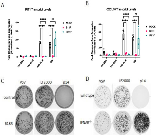The antiviral responses to endogenously or exogenously delivered p14 requires IRF3 and IFN-I. (A,B) Wildtype or IRF3−/− THF cells expressing p14 under a doxycycline-inducible promoter were treated with doxycycline for the indicated time and the IFN-blocking antibody B18R where indicated; then, RNA was harvested for qRT-PCR to detect (A) IFIT1 or (B) CXCL10 transcripts. (C) Wildtype THF cells were pretreated with B18R (200ng/mL) to block IFN, or (D) wildtype and IFNAR−/− cells were not pretreated and then were transfected with p14/LF2000 and subsequently challenged with VSV-GFP 16 h post treatment. Groups were compared by one-way ANOVA (*** for p < 0.001 and **** for p < 0.0001).