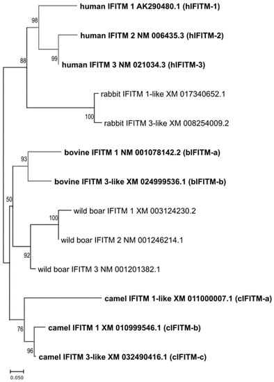 Phylogenetic tree of human, rabbit, bovine, wild boar, and camel IFITMs. The phylogenetic tree was built using the Maximum Likelihood method and Tamura-Nei model with MEGA X software. The percentage of trees in which the associated taxa clustered together is shown next to the branches. In brackets, the names we assigned to the IFITMs analyzed in this study. hIFITM-1, human IFITM-1; hIFITM-2, human IFITM-2; hIFITM-3, human IFITM-3; bIFITM-a, bovine IFITM-a; bIFITM-b, bovine IFITM-b; cIFITM-a, camel IFITM-a; cIFITM-b, camel IFITM-b; cIFITM-c, camel IFITM-c.
