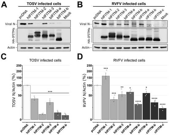 Western blot analyses of TOSV and RVFV N proteins from infected cells expressing the different IFITMs. Infection assays with TOSV (A,C) or RVFV (B,D) were performed in HEK293T cells expressing or lacking (pcDNA3.1) the different IFITMs, as indicated. Cells were collected at twenty-four hours post-infection and analyzed by Western blot with antisera raised against TOSV or RVFV N proteins, HA (to detect IFITMs), or actin, as specified. Each experiment was performed three times, independently. Representative blots are presented in panels (A,B). Signals of TOSV and RVFV N proteins, and actin proteins were quantified from, at least, three independent experiments using Image Lab software. The ratios of TOSV N/Actin (C) and RVFV N/Actin (D) are reported on the graphs and are relative to those obtained in control cells (pcDNA), arbitrarily set as 100%. Statistical analyses were performed with a Kruskal–Wallis test, and significance (compared to pcDNA control) is presented as follows: p < 0.05 (*), p < 0.01 (**), p < 0.001 (***) and p < 0.0001 (****). hIFITM-1, human IFITM-1; hIFITM-2, human IFITM-2; hIFITM-3, human IFITM-3; bIFITM-a, bovine IFITM-a; bIFITM-b, bovine IFITM-b; cIFITM-a, camel IFITM-a; cIFITM-b, camel IFITM-b; cIFITM-c, camel IFITM-c.