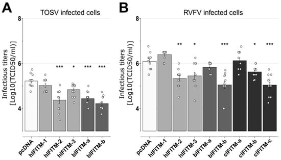 Finally, we found that all the IFITMs, with the exception of hIFITM-1, significantly reduced TOSV viral titers in the cell supernatants (Figure 6A). Conversely, when infecting with RVFV, all the IFITMs tested, except hIFITM-1, bIFITM-a, and cIFITM-a, led to a significant decrease in viral infectious titers (Figure 6B).