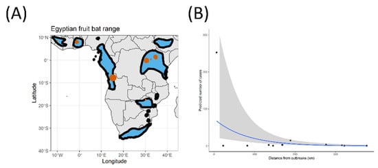 We obtained the spatial range of the Egyptian fruit bat as a polygon shapefile from the IUCN red list repository []. Using this information, we then extracted the minimum distance between each location and the edge of the closest polygon, representing a minimum distance between a Marburg virus outbreak and the distributional edge of the natural reservoir of the Marburg virus using ArcGIS V10.4 [].