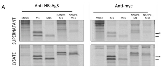 The myc-tagged wt M1- and myc-tagged mutant M15-HBsAgS proteins were expressed in human embryonic kidney HEK293T cells transfected with the appropriate expression plasmids using polyethylenimine (PEI, Polysciences Inc., Warrington, PA, USA), as previously described [29,31]. A total of 3 × 105 cells were seeded into each well of a 6-well tissue culture dish (BD Bioscience, Bedford, MA, USA) and transfected with 3 μg plasmid DNA the following day. After two days, the cell culture medium was harvested and assessed for the presence of myc-tagged HBsAgS proteins by ELISA. The cells were incubated in cysteine- and methionine-free DMEM (Dulbecco’s modified Eagle’s medium) for 45 min before the addition of 200 mCi 35S-labelled cysteine and methionine (Perkin Elmer, Waltham, MA, USA). The cells were incubated for 3 h; then, the medium was replaced with DMEM supplemented with 10% fetal calf serum (FCS) and incubated for 18 h. The cell culture medium was harvested and the cells lysed in 200 μL NP40 lysis buffer (150 mM NaCl, 1% NP40, 50 mM Tris, pH8). Iodoacetamide at a final concentration of 20 mM was added to the cell culture medium and diluted lysate, then incubated on ice with the mouse monoclonal anti-myc antibody (9E10, Invitrogen, Waltham, MA, USA) or polyclonal rabbit anti-HBsAgS antibodies (Meridian Life Science, Memphis, TN, USA) in the presence of protein A sepharose. After incubation at 4 °C with rapid agitation, the samples were washed three times with RIPA buffer (150 mM NaCl, 1% NP-40, 1% sodium deoxycholate, 0.1% SDS, 10 mM Tris-HCl pH 7.5), and once with 100 mM Tris-HCl, pH6.8. The samples were denatured in Laemmli buffer, separated by 15% SDS-polyacrylamide electrophoresis (SDS-PAGE), fixed, dried, and exposed on a Typhoon Phosphorimager (GE Healthcare, Chicago, IL, USA).