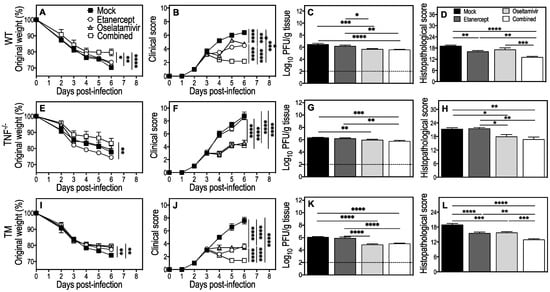 Combined treatment with etanercept and oseltamivir reduces clinical scores, lung viral load, and pathology in IAV-infected WT, TNF−/−, and TM mice. Age-matched groups of WT, TNF−/−, and TM (n = 4 or 5) female mice were infected with 3000 PFU IAV i.n. and treated with oseltamivir (150 mg/kg), etanercept (2.5 mg/kg), or a combination (combined) on days 3, 4, and 5 p.i. Animals were monitored for weight loss (A,E,I) and clinical scores (B,F,J) until day 6 p.i., when all animals were euthanized and lung tissue collected for various analyses. Data were analyzed by two-way ANOVA with Sidak’s post-tests and expressed as means ± SEM. Viral load (C,G,K) data was log-transformed, analyzed using ordinary one-way ANOVA test followed by Fisher’s LSD tests, and expressed as means ± SEM. Histopathological scores (D,H,L) were derived from microscopic examination of lung histology H&E sections (presented in Figure 3), analyzed using ordinary one-way ANOVA test followed by Tukey’s multiple comparisons tests and expressed as means ± SEM. *, p < 0.05; **, p < 0.01; ***, p < 0.001, and ****, p < 0.0001. Broken lines in panels (C,G,K) correspond to the limit of virus detection.