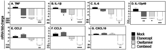 Compared to mock treatment, etanercept or oseltamivir reduced mRNA transcripts for TNF, IL-1β, and IL-12p40 (Figure 4A,B,D), whereas the combined treatment was more effective in decreasing the levels of those cytokines as well as IL-6 and the chemokines CCL2, CCL5, and CXCL10 (Figure 4C,E–G).