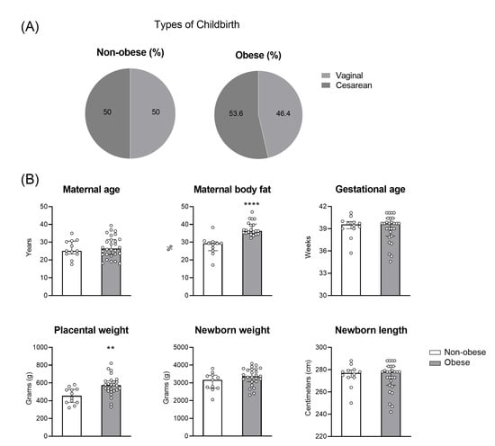 Demographic data of non-obese and obese mothers and newborns. A cohort of full-term pregnant women were assessed from the non-obese (white bar; n = 11) and obese (gray bar; n = 28) groups. The type of delivery (A), maternal age, maternal body fat, gestational age, placental and newborn weight, and newborn length (B) was obtained from the maternity hospitals. The bars represent the median and interquartile range of the values. ** p ≤ 0.01; **** p ≤ 0.0001.