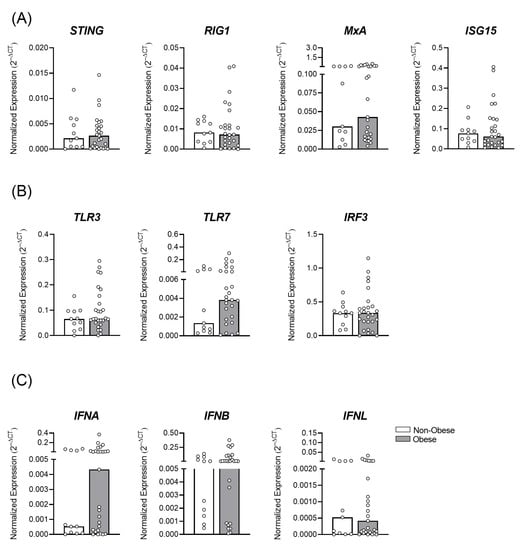 A similar profile of the constitutive transcriptional expression of antiviral factors, STING, RIG-I, MxA, and ISG15 was observed between the non-obese and obese groups (Figure 2A). Other factors such as the innate viral recognition receptors, TLR3 and TLR7, the interferon regulatory factor 3 (IRF3) (Figure 2B), as well as type I (IFNα and β) and III IFNs (IFNλ, Figure 2C) did not change the expressions between the groups. These data show that despite the BMI of the women in this cohort, there was an important regulation of the antiviral/inflammatory factors to maintain local homeostasis.