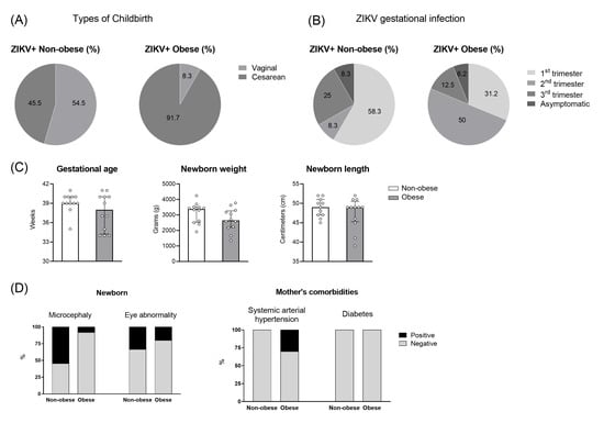 Demographic data of non-obese and obese mothers and newborns with Zika virus (ZIKV) infection. A cohort of full-term pregnant women were assessed from the non-obese (white bar; n = 14) and obese (gray bar; n = 16) ZIKV+ congenital infection groups. The type of delivery (A), gestational trimester of ZIKV infection (B), gestational age, newborn weight, and length (C), and newborn’s abnormalities and mother’s comorbidities (D) was obtained from the maternity hospitals. The bars represent the median and interquartile range of the values.