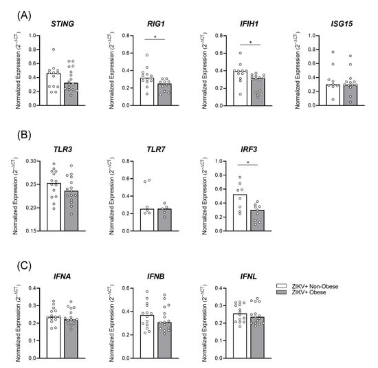 The IRF3 and RIG-I axis plays an important role during ZIKV infection, as one of the main sensors for this virus [35]. Importantly, one of the mechanisms through which ZIKV can antagonize the interferon response is through interaction with the RIG-I-MAVS [36]. Moreover, regarding obesity, it has been described that the mice deficient in the RIG-I receptor had worsening weight gain, white adipose tissue, and insulin resistance, induced by a hyperlipidemic diet [37].