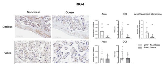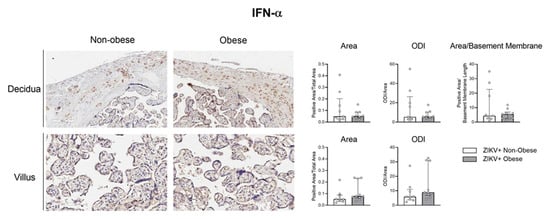 Next, we aimed to access the protein expression of some target factors observed at the transcriptional level. The maternal placental side, decidua, and the fetal side, villus, from ZIKV-infected mothers with and without obesity were analyzed by immunohistochemistry for IRF-3, RIG-I, and IFN-α. The positive area was measured, and optical density intensity (ODI) was performed for each of the markers.