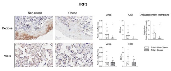 Figure 5 shows a decreased RIG-I protein expression level in the decidua of the ZIKV-infected mothers with obesity compared to the non-obese group, both in the positive area (p = 0.001) evaluation and the ODI (p = 0.001). This finding was like that obtained from the transcript expression level. We also verified a decreased expression of IRF-3 in the placental decidua of mothers with obesity (Figure 6; area p = 0.0015; ODI p = 0.0015; area/basement membrane p = 0.0004). These data reinforce that metabolic syndrome has a direct impact on the antiviral response of the maternal–fetal interface.