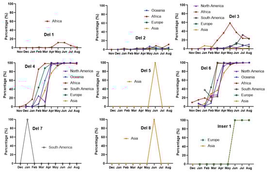 Temporal distribution of the deletions and insertions on the six continents were analyzed. To avoid bias caused by small numbers, early months with fewer than 30 sequences were excluded in this study, including all the regions except Africa in November 2021 and Asia and Europe in December 2021. Results showed that the distributions of the deletions/insertions exhibited commonality and characteristics across continents. Specifically, both Del 4 and Del 6 had low frequencies in the early stage but increased significantly over time and rapidly reached 100%. Del 3 presented a higher frequency in Africa than in other continents; the frequency increased markedly from February and reached a peak in May (with a frequency about 60%), then declined to the same level as South America. Both Del 1 and 2 exhibited low occurring frequencies in each month, and Del 1 appeared only in May to July in Africa. Del 5/8 and 7 only presented in June in Asia and in January in South America, respectively, and occurred with 100% frequency. Inser 1 started to appear in Europe and Asia in June with occurring frequency of 100% (Figure 1).