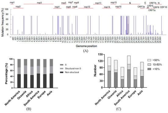 SNPs’ distributions. (A) Total SNPs of the sequences collected in this study. A total of 130 SNPs was found. (B) Gene distribution. Structural genes presented more SNPs than the non-structural genes. S gene had the most SNPs. (C) Number of SNPs on different continents. SNPs with high frequency (>50%) were comparable among the continents.