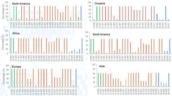 We also analyzed distributions of SNPs with frequencies more than 5% in the Nsp12, S, and N genes on the six continents (Figure 3). Results showed that Nsp12, encoding the viral RNA-dependent RNA polymerase (RdRp), harbored two SNPs (T14963C and C15437T) with high frequency on all the continents, and two unique SNPs (A14543G and T14732C) were found in Oceania and North America, respectively. Interestingly, all the SNPs in RdRp caused synonymous mutations. In the S gene, the numbers of SNPs in different regions were similar, which was 26 in South America and 21–23 in other continents. Oceania and Africa had 17 high-frequency SNPs, North America had 15, and the other four continents had 14. There were a total 19 SNPs commonly occurring on all six continents. Except nucleotide position 22313, the other 18 commonly occurring SNPs had high-occurring frequencies (>50%), while for the other 18 non-commonly detected ones, the frequencies were relatively low (<20%) except four sites (21,902 and 21,903 in Asia and Europe, 21,904 in Asia, and 22,596 in South America). There were 10 commonly detected and three unique SNPs (22,506, 22,527, and 22,596) located in the RBD. 22,506, 22,527, and 22,596 were detected in South America, 22,506 in Europe, and 22,596 in Africa. All the 10 commonly detected ones exhibited high frequencies, while the three unique ones did not. In the N gene, A28044G and A29215C were commonly detected on the six continents, with A29215C having high-occurring frequency. C28429T was found in Oceania, Africa, and South America. Uniquely detected SNPs (G28386T, C28429T, and C29371T) were found with relatively low frequencies (Figure 3).