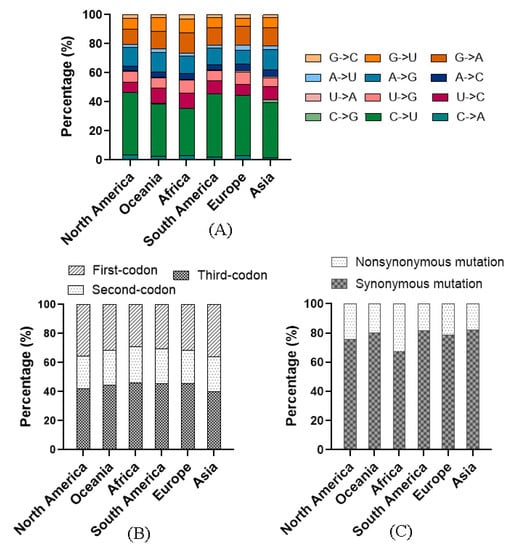 We analyzed mutation directions of the substituted base and found the pattern was similar among the six continents. Mutation from C to U occurred the most, with frequencies ranging from 33.4% (in Africa) to 43.45% (in South America), accounting for more than one third of the 12 different mutation directions. The frequency of mutations from U to C, A to G, and G to A were all about 10%, while the total frequency of the other eight directions was less than 30% (Figure 4A). Notably, position 22,313 in North America and Africa had two mutation directions: G to A and G to C, leading to amino acid change of R to K and G to C; their occurring frequencies were 85.4% versus 14.6% and 91.7% versus 8.3%, respectively, and position 22,631 in North America and South America also harbored two directions: T to G and T to A, leading to amino acid change of L to R and T and L to Q, with occurring frequency of 69.5% versus 30.5% and 88.9% versus 11.1%, respectively. We also examined the distribution of mutations on the three different codon positions. It was shown that mutation proportions occurring in the third codon position on different continents were all higher than one third: they ranged from 40.2% in Asia to 46.2% in Africa (Figure 4B). It is worth noting that most mutations on the third codon position caused synonymous mutation, especially in Oceania, South America, and Asia, where the proportion of synonymous mutations was more than 80%, followed by North America and Europe, with 75.9% and 78.6%, respectively, while Africa with 67.4% was the lowest (Figure 4C).