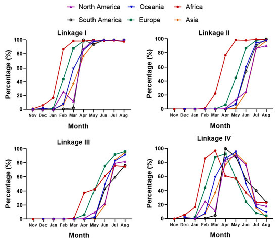 Temporal distribution revealed that the occurring frequencies of linkages I, II, and III sharply increased in a short time, and then all maintained at a high level, while the occurring frequency of linkage IV increased remarkably, but the high frequency only lasted for two months before it quickly decreased to a very low level. The four linkages were all first detected in Africa, followed by Europe, and the detections in North America, South America, and Asia were the latest. For linkage II, it was detected in Europe two months following being detected in Africa, and the other three were all detected in Europe one month following Africa (Figure 5). In this study, no unique SNP linkage was found on any of the six continents.