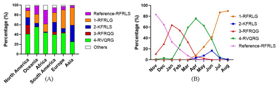 As stated above, ten commonly detected SNPs on the six continents were located in RBD, among which 6 (L368F, T373A, D402N, R405S, S443G, and S493G) were tightly linked and exhibited a high-occurring frequency, while the other four (R343K, L449Q/R, F483V, and R490Q) were not linked together. We calculated the proportions of different amino acid combinations on these substituted sites on the six continents. For convenience, the tightly linked sites were marked together and recorded as 493. The amino acids corresponding to positions 343, 483, 490, 449, and 493 in the reference sequence were RFRLS. We found four major different amino acid combinations, i.e., 1-RFRLG, 2-KFRLS, 3-RFRQG, and 4-RVQRG. Specifically, in South and North America, all four combinations were widely detected, while in Oceania, Europe, and Asia, 1-RFRLG, 2-KFRLS, and 4-RVQRG were the major detections. In Africa, it was 1-RFRLG and 4-RVQRG (Figure 6A). In total, the proportion of reference RFRLS decreased over time, while 1-RFRLG increased over time and finally was definitely predominant, and 3-RFRQG and 4-RVQRG only transiently existed with high-occurring frequency (Figure 6B).