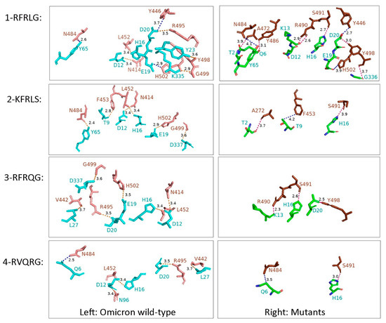 Interaction changes of the four mutants. The mutant 1-RFRLG may slightly have enhanced the interactions between RBD and hACE2, while the other three potentially weakened the interactions. Left column, Omicron wild-type; Right column, mutants. The interactions presented both in wild-type and mutants were not listed, while the changed interactions with the distance <5 Å were marked. Orange bonding stick, interactions only in the wild-type; hot pink bonding stick, interactions only in the mutants; blue bonding stick, changed interactions but within 5 Å both in the wild-type and the mutants.