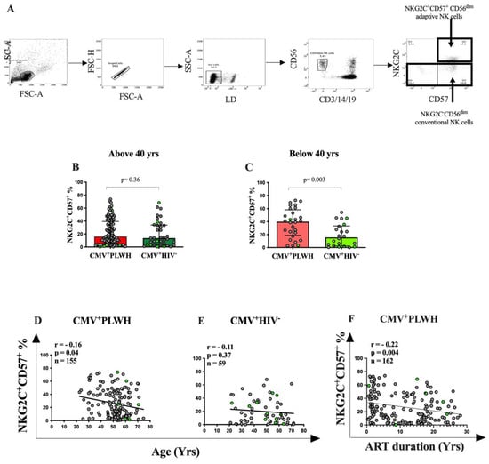 We first evaluated the frequency of NKG2C+CD57+CD56dim adaptive NK cells in CMV+PLWH and CMV mono-infected individuals enrolled in the CHACS. Figure 1A shows the strategy used to gate on adaptive NK and conventional NK cells, which were identified as live, singlet, lymphocytes, which were CD3-CD14-CD19-CD56dim. There was no significant between-group difference in the frequency of NKG2C+CD57+CD56dim adaptive NK cells in CMV+PLWH and CMV mono-infected CHACS subjects aged >40 yrs (16.1% (6.6, 39.0] vs. 13.7% (4.3, 33.4], respectively, p = 0.74, Mann—Whitney test) (Figure 1B). Some previous studies had reported that CMV+PLWH had higher frequencies of adaptive NK cells than CMV mono-infected individuals [38,39,40]. In two of these reports, the age range of the populations studied was not reported [39,40] while in Heath et al., the median age of the CMV+PLWH and CMV mono-infected populations overlapped that of the participants in the CHACS [38]. We questioned whether age may affect the frequency of adaptive NK cells and whether the differences between our results and those generated by others with respect to between-group differences in adaptive NK cell frequencies was due to differences in age. When we screened CMV+PLWH and CMV mono-infected individuals aged <40 yrs for the frequency of their adaptive NK cells, we found that their frequency was significantly higher in CMV+PLWH than in CMV mono-infected subjects (39.8% (18.8, 58.2) vs. 15.6% (2.5, 33.3), p = 0.003, Mann—Whitney test) (Figure 1C). Furthermore, the frequency of adaptive NK cells was inversely correlated with age for all CMV+PLWH (Groups 1 and 3) (r = −0.18, p = 0.02, Spearman correlation test) (Figure 1D). While a similar inverse correlation between the frequency of adaptive NK cells and age was noted for CMV mono-infected individuals (Groups 2 and 5), this observation did not achieve statistical significance (Figure 1E).