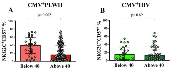 CMV+PLWH who are older than 40 yrs of age have lower frequencies of adaptive NK cells than those who are younger than 40 yrs of age. The y-axes show the frequency of NKG2C+CD57+CD56dim NK cells in (A) CMV+PLWH and (B) CMV mono-infected (CMV+HIV−) subjects who are <40 and >40 yrs of age. Each data point represents a single individual. Bar graph heights and error bars show the median and IQR for the frequency of adaptive NK cells for each group. Bars colors identify the same groups as in Figure 1 panel B and C. Mann—Whitney tests were used to assess the statistical significance of between-group differences for the frequency of adaptive NK cells. p-values indicating the significance of between group differences are shown over the lines linking the groups being compared. Data points corresponding to results attributed to females are distinguished from those attributed to males by being shown in light green.