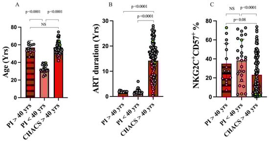 To address whether age or time on ART was a more important determinant of changes in the frequency of adaptive NK cells, we examined the frequency of these cells in 15 PI cohort participants who were >40 yrs of age but on ART for 1.94 (1.8, 2.0) yrs. In terms of age, these older PI subjects did not differ from CHACS participants but were older than the PI cohort individuals who were <40 yrs old (Figure 3A). In terms of time on ART, the two PI groups did not differ from each other and both were younger than the CHACS participants (Figure 3B). The frequency of adaptive NK cells did not differ in the PI cohort subjects who were less than versus greater than 40 yrs of age. The percent of these cells was higher in younger PI subjects than in CHACS participants and trended toward being higher in older PI subjects than in CHACS participants (Figure 3C). Together, these results support the interpretation that increasing length of time on ART, rather than increasing age is associated with declining frequencies of adaptive NK cells. Furthermore, the absence of an effect of age on the frequency of adaptive NK cells in CMV mono-infected individuals (Figure 1E and Figure 2B) would support this conclusion as they are ART naïve.