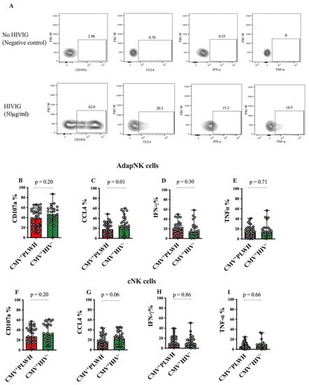 The frequency of adaptive NK (Figure 4B–E) and conventional NK (Figure 3F–I) cells producing CD107a, IFN-γ and TNF-α did not differ significantly when from CMV+PLWH or CMV mono-infected subjects (Mann—Whitney). Although the frequency of adaptive NK, but not conventional NK cells producing CCL4 was higher or showed a trend towards being higher in CMV-mono-infected persons compared to CMV+PLWH, the difference fell below the level of significance when a Bonferroni correction was applied. The significance of this observation was that it shows that the frequency of functional adaptive NK cells persists in the setting of treated HIV infection.